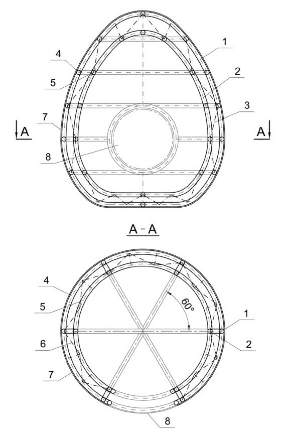 Zastosowany kształt kapsuły ochronnej zapewnia efektywne wykorzystanie przestrzeni oraz wysoką wytrzymałość na obciążenia zewnętrzne. Proponowana konstrukcja składa się sześciu kratownic pionowych tj. południków, rozstawionych co 60° wokół osi oraz połączonych dookoła za pomocą kratownic poziomych tj. równoleżników. Elementy konstrukcji wykonane są z kompozytowych, okrągłych kształtowników, co zapewnia wysoką wytrzymałość przy niewielkiej masie całej konstrukcji.